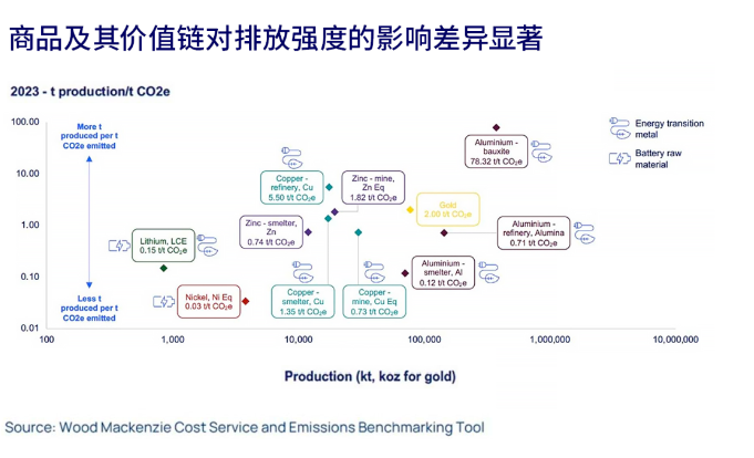 在金属和采矿行业,各种不同的大宗商品以及价值链各环节所面临的排放“战场”是不对称的(见下图)。我们在对各地区进行深入考察和对标之后发现,特定大宗商品生产中产生特有的排放源和特有的某范围排放,这限定了碳产生源。
