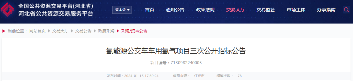 近日,河北氢能源公交车车用氢气项目发布三次公开招标公告。