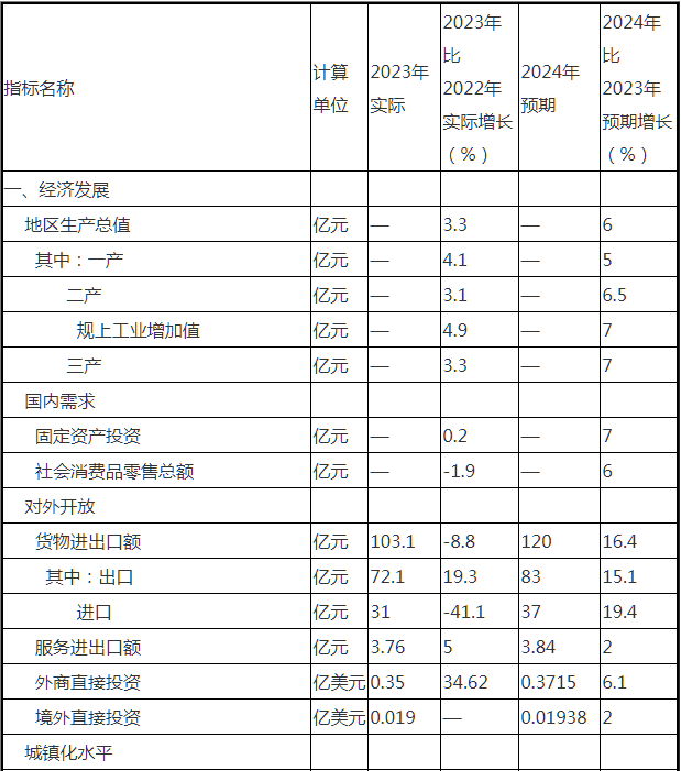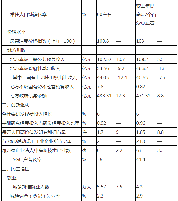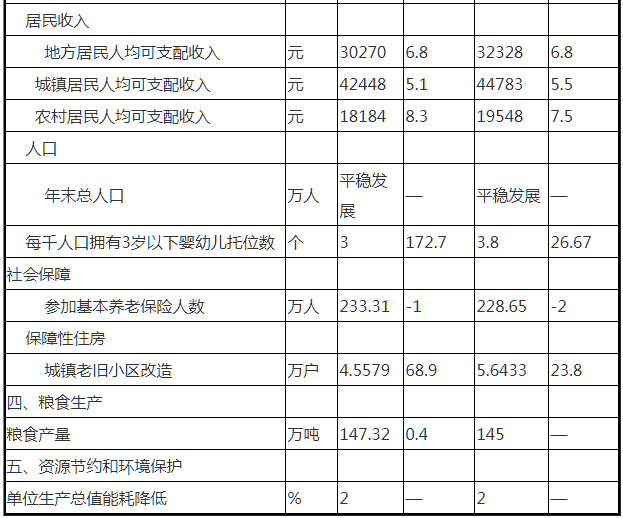 地区生产总值增长6%左右,规模以上工业增加值增长7%,固定资产投资增长7%,社会消费品零售总额增长6%,一般公共预算收入增长5.5%,城乡居民人均可支配收入分别增长5.5%和7.5%,城镇新增就业4.3万人,粮食产量145万吨以上,单位生产总值能耗降幅2%以上、力争“十四五”以来累计降低10%左右。