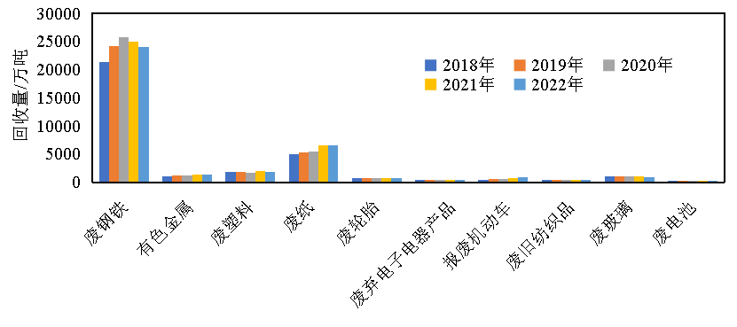再生资源回收量有所增加。根据商务部以及中国物资再生协会联合发布的《中国再生资源回收行业发展报告》显示,我国再生资源种类主要包括废钢铁、废有色金属、废塑料、废纸、废轮胎、废弃电子电器产品、报废机动车、废旧纺织品、废玻璃和废电池(铅酸除外),其中回收量最大的是废钢铁,其次是废纸。与2018年相比,2022年我国再生资源回收总量增加了15.26%。
