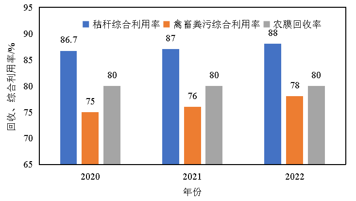农业固体废物综合利用水平稳步提高。根据生态环境部发布的《中国生态环境状况公报》显示,2020-2022年我国畜禽粪污综合利用率和秸秆综合利用率逐年增加,分别由2020年的75%和86.7%增加到2022年的78%和88%,农膜回收率保持稳定在80%。
