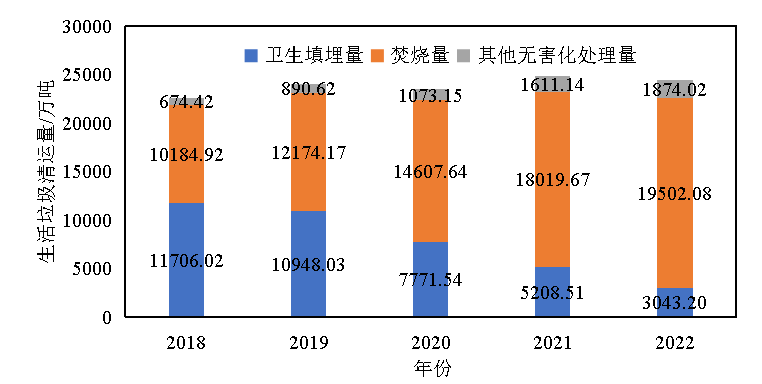 生活垃圾分类见成效,焚烧及其他无害化处理水平提升。截至2022年底,297个地级及以上城市居民小区垃圾分类平均覆盖率达到82.5%,根据中国城市环境卫生协会数据显示,2022年我国餐厨垃圾处理量达到1.74亿吨,较上年增长10.16%。根据住房和城乡建设部发布的《城乡建设统计年鉴》显示,2018—2022年我国城市生活垃圾清运量基本保持稳定,焚烧量以及其他无害化处理量持续增加,2022年焚烧和其他无害化处理的比例达到79.86%和7.67%。