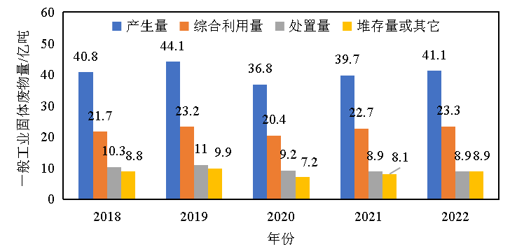 工业固体废物体量大,综合利用率有待提升。随着我国工业固体废物产生量持续增长,历年堆存的工业固体废物已超过600亿吨。根据生态环境部公布的《中国生态环境统计年报》(2018-2022年)显示,与2018年相比,2019年一般工业固体废物产生量较高,达到44.1亿吨。2021年综合利用率为近五年最高达到57.18%,2022年比2021年降低了0.49%,综合利用水平有待提升。