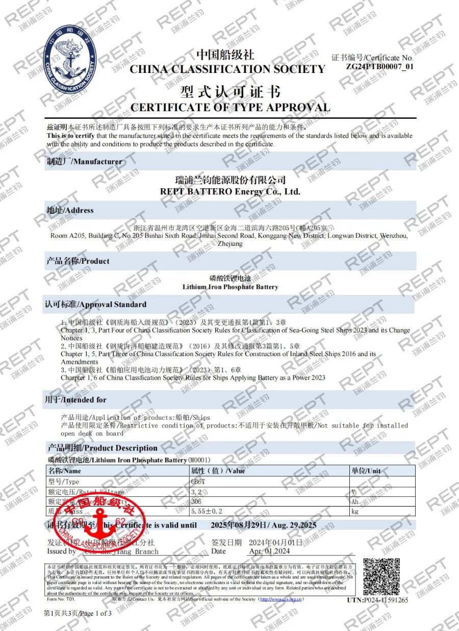 瑞浦兰钧306Ah电池经过严格的图纸审核、产品型式试验、严苛的船海工况测试和工厂审核,最终获得中国船级社的认证。这不仅证明了306Ah电池在设计和制造方面上的卓越性能,也标志着306Ah电池完全满足船级社的认证标准。