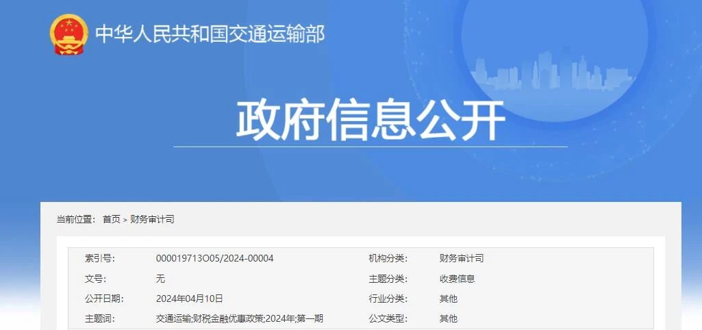为帮助交通运输企业和从业者及时了解国家出台的财税金融支持政策内容,用足用好优惠政策,我部梳理形成了《涉交通运输业国家主要财税金融优惠政策目录清单》(2024年第一期,2023年10月10日至2024年3月31日),本期《清单》共包括11项财税金融优惠政策。