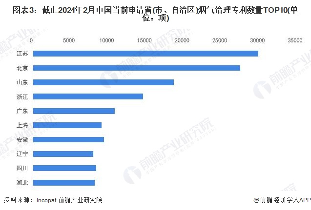 中国方面,江苏为中国当前申请烟气治理专利数量最多的省份,累计当前烟气治理专利申请数量高达29913项,其次为北京,相关专利申请量为27488项。另外,山东、浙江、广东、上海当前申请烟气治理专利数量均超过1万项。中国当前申请省(市、自治区)烟气治理专利数量排名前十的省份还有安徽、辽宁、四川、湖北。