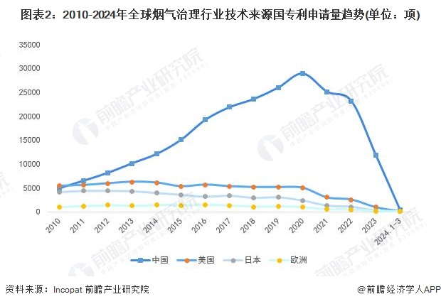从趋势上看,2010年以来,中国烟气治理专利申请量持续上升,在2011年超过美国后不断拉大与其他国家的差距,2023年,中国烟气治理专利申请量累计超过2.9万项,高于美日欧专利申请量之和。