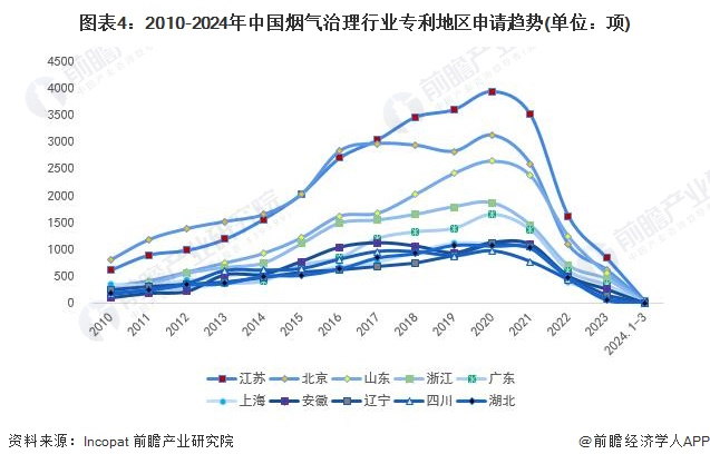 趋势方面,2010-2017年期间,江苏和北京烟气治理专利申请量差距较小,然而自2017年后,江苏逐渐拉开与北京的距离,并一直位居榜首。山东省专利在2017年后也快速增长,逐渐缩小了和北京、江苏的差距。上海、安徽、辽宁、四川和湖北近年来专利申请量差距不大。