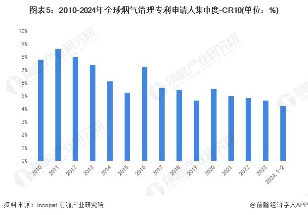 2010-2024年3月,全球烟气治理专利申请人CR10呈现波动下降趋势,由2010年的7.79%波动下降至2024年3月的4.2%。整体来看,全球烟气治理专利申请人集中度很低。
