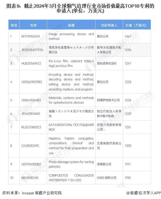 全球烟气治理市场价值最高TOP10专利中,索尼公司独占两席,其他专利申请人包括水处理技术公司、化工企业、医药公司等。