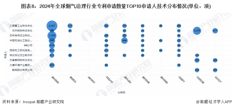 目前,全球烟气治理行业专利申请数量TOP10申请人技术主要布局在B01D53细分领域,其中全球烟气治理专利申请量第二的三菱重工株式会社在该细分领域专利申请量达到2327项。