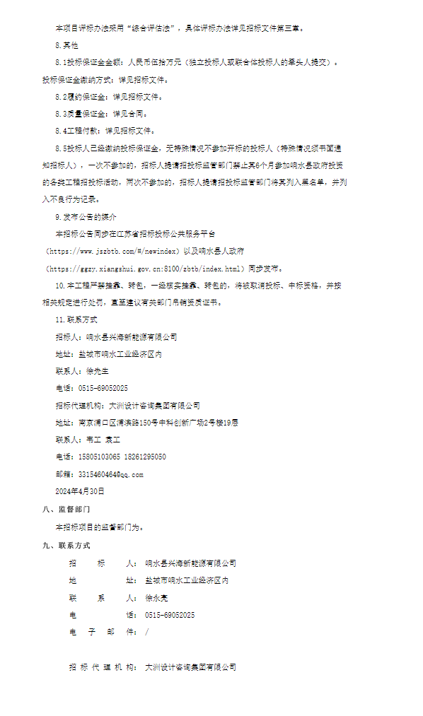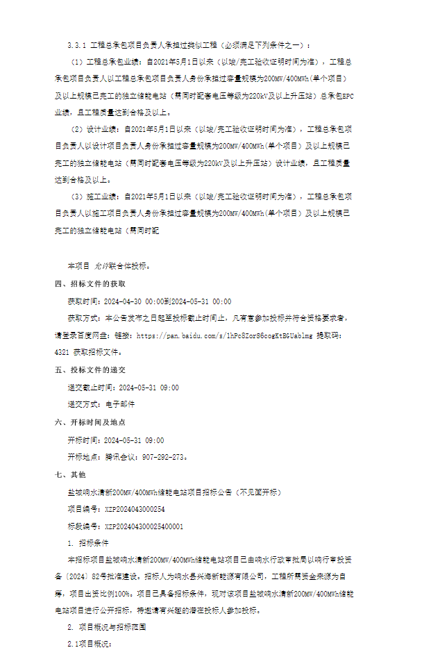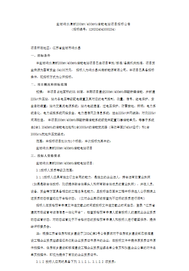4月30日,江苏盐城响水清新200MW/400MWh储能电站项目招标公告发布。