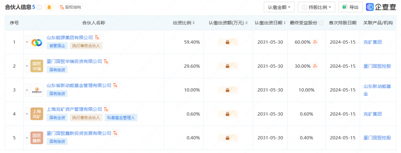 该基金注资100亿,其中山东能源集团有限公司出资59.4%,厦门国贸华瑞投资有限公司出资29.6%。