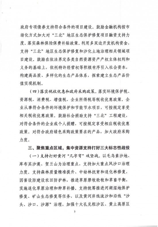 鼓励金融机构按市场化方式加大对“三北”地区生态保护修复项目融资支持力度。落实森林保险保费补贴政策。利用多双边开发机构资金,支持“三北”地区生态保护修复和沙化土地治理相关领域项目建设。落实税收优惠和政府采购政策。落实环境保护税、资源税、消费税、增值税、企业所得税等税收优惠政策。企业从事符合条件的环境保护和节能节水项目,可按规定享受相关税收优惠政策。