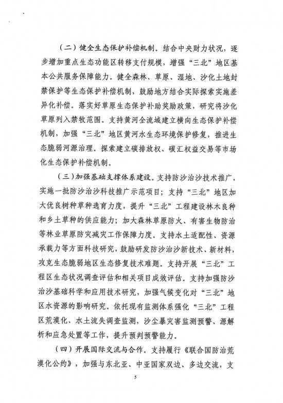 内容指出,设立“三北”工程补助资金。中央财政加强资源统筹,优化支出结构,设立“三北”工程补助资金,支持林草湿荒一体化保护修复,用于退化林修复、退化草原修复、中幼林抚育、湿地保护修复等;支持巩固防沙治沙成果,用于新治理沙化土地(人工造林)管护、浇水、补植等;支持沙化土地封禁保护补偿,对暂不具备治理条件和因保护生态需要不宜开发利用的连片沙化土地依法实施封禁保护;支持“产业生态化、生态产业化”示范,对推动示范、引导社会资本采取科学有效方式开展防沙治沙成效显著的地方给予奖补。资金聚焦重点、突出难点,强化对重大任务、关键环节的保障力度,提高政策精准性。
