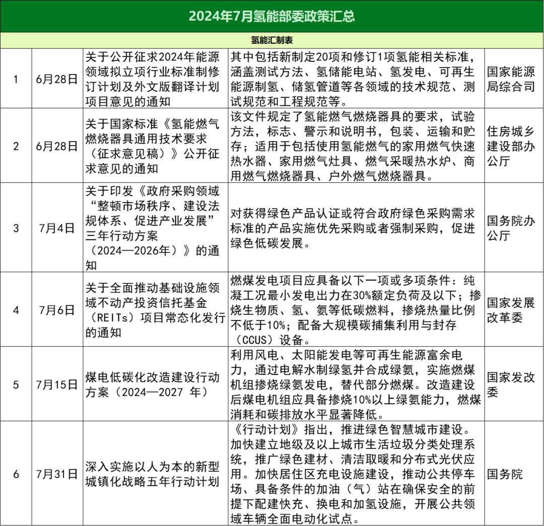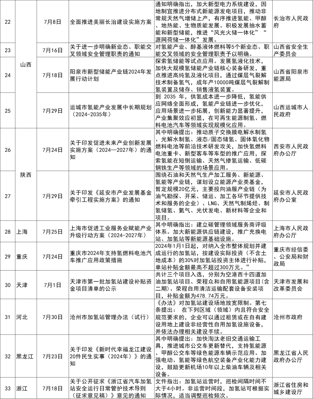 2024年7月,伴随节能减碳的深入推进,氢能走进多项与民生有关的政策当中。在国务院及部委层面,有6项政策发布。在地方层面,12个省份发布了33条氢能相关政策。