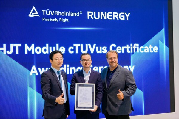 国际知名第三方检测、检验和认证机构德国莱茵TÜV(以下简称"TÜV莱茵")为润阳股份的HJT系列产品授予了cTUVus美标认证证书。润阳股份全球组件营销中心技术支持总监Peter Peng先生,TÜV莱茵集团美洲区产品服务事业群副总裁Jonathan Kotrba先生,以及TÜV莱茵集团全球电力电子产品服务副总裁兼大中华区太阳能与商业产品服务总经理李卫春先生共同出席了颁证仪式。
