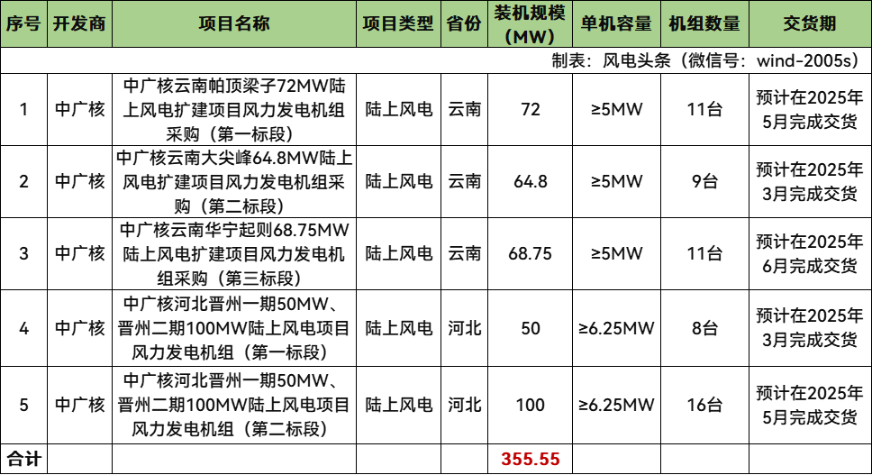 中广核河北晋州一期50MW、晋州二期100MW陆上风电项目风力发电机组(第二标段)项目容量100MW,投标机型总容量不应超过100MW(投标机型总容量上浮不应超过1MW),项目机位数量16台;投标机型台数不应超过机位数量,单机容量6250kW及以上。计划交货日期:预计在2025年5月完成交货。