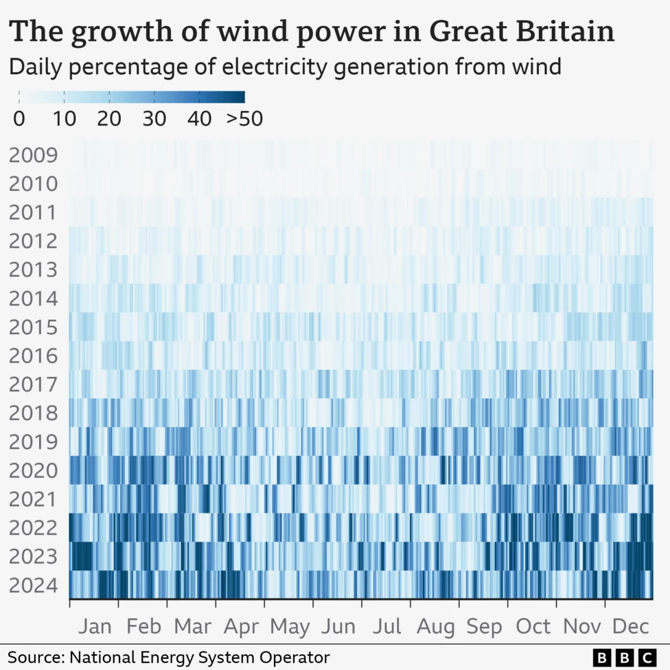 图表中的方格代表了自 2009 年以来英国每天风力发电的份额。在图表顶部的 2010 年代初,风力发电量很少,因此条形图以浅蓝色显示。到图表底部的 2020 年代初,风力发电量增加,因此条形图的蓝色逐渐加深,尤其是在冬季。