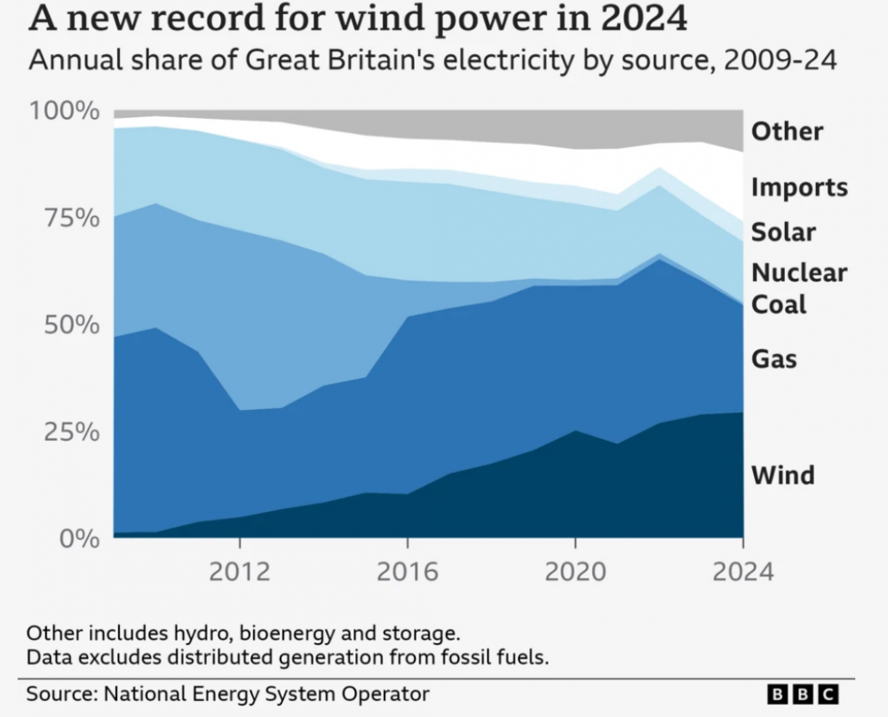 最新数据显示,随着英国进一步摆脱化石燃料,2024年英国风力发电创新高。