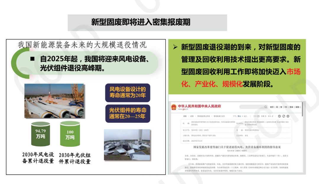 我国新能源产业大规模发展始于2004年左右,风电设备设计寿命通常为20年,光伏组件的使用寿命通常在20-25年,随着风电项目“以大换小”增容改造行动深入开展、光伏技术设备快速迭代更新,自2025年起,我国将迎来风电、光伏装备退役高峰期。据公开报道,预计到2030年风机退役量将超过3万台,由此带来的固废规模将达到94.79万吨,光伏组件累计退役量将达到100万吨。新型固废退役潮的到来,对新型固废的管理及回收利用技术都提出更高要求。2023年8月,国家发展改革委等六部委联合印发《关于促进退役风电、光伏设备循环利用的指导意见》,对风电、光伏领域退役设备循环利用工作做出全面系统部署。叠加2024年出台的大规模设备更新政策,以及成立中国资源循环集团等新动向,新型固废回收利用工作即将加快迈入市场化、产业化、规模化发展阶段。