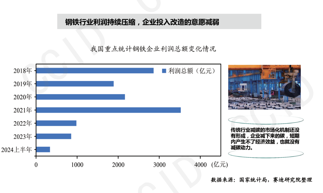 企业绿色转型需要较多资金和技术投入,且投资回报周期较长,广大经营主体的资金条件和技术水平难以达到绿色低碳转型要求。比如,受房地产下行、市场需求萎缩影响,钢铁、建材行业利润持续压缩,企业投入改造的意愿大不如前。比如,2018年启动超低排放改造时重点钢铁企业利润近3000亿,约为2023年的3倍,2024年上半年重点钢铁企业利润仅为339亿元,平均销售利润率仅1.1%,资产负债率约63%,经营风险在增加。吨钢超低排放改造投资约400元,运行成本约200元,如果经济效益持续下降,企业将难以负担改造投资。企业普遍反映,现在传统行业减碳的市场化机制还没有形成,企业减下来的碳,短期内产生不了经济效益,也就没有了减碳动力。