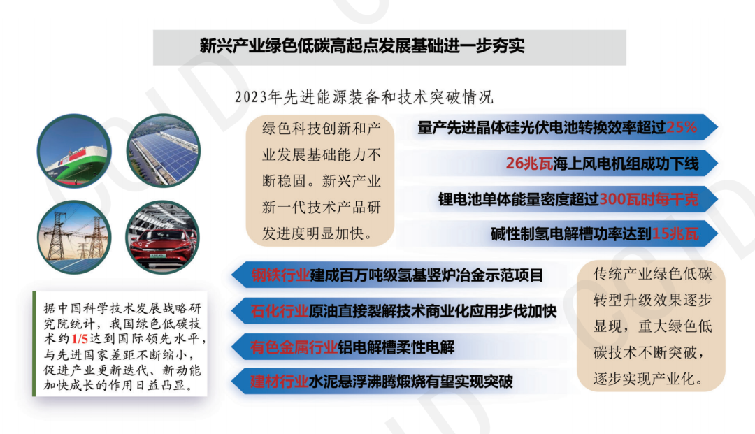 我国绿色低碳科技创新和产业发展基础能力不断稳固。新能源汽车、新能源装备、节能环保等绿色低碳产业蓬勃发展,规模持续扩大,新一代技术产品研发进度明显加快。量产先进晶体硅光伏电池转换效率超过25%,26兆瓦海上风电机组成功下线,锂电池单体能量密度超过300瓦时每千克、循环寿命超过3000次,碱性制氢电解槽功率达到15兆瓦。传统产业绿色低碳转型升级效果逐步显现,钢铁行业建成百万吨级氢基竖炉冶金示范项目,以氢代碳深度脱碳技术将逐步产业化,石化行业原油直接裂解技术商业化应用步伐加快,有色金属行业铝电解槽柔性电解、建材行业水泥悬浮沸腾煅烧等重大低碳技术有望实现突破。总体看,据中国科学技术发展战略研究院统计,我国绿色低碳技术约1/5已达到国际领先水平,与先进国家差距不断缩小,促进产业更新迭代、新动能加快成长的作用日益凸显。