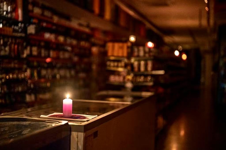 4月28日,在西班牙巴塞罗那,一家小超市点着蜡烛营业。
