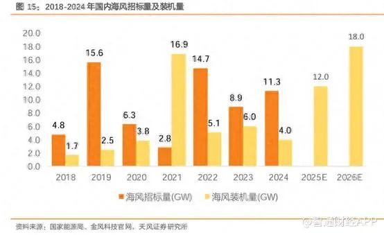 从规划看,十四五各省海风规划共65GW,十四五装机预计44GW,尚有21GW待装机;再加上2023-2024年新增竞配51.15GW(大多为十四五规划以外增量),奠定后续装机基础;从招标看,海风建设周期为2年左右,天风证券统计2018-2024年海风新增招标为70GW,对应装机为41GW,尚有29GW待装机,尤其2022-2024年行业装机放缓,招标规模明显高于装机;从开工看,各省公布25年重点开工海风项目共52GW,将于25-26年并网。