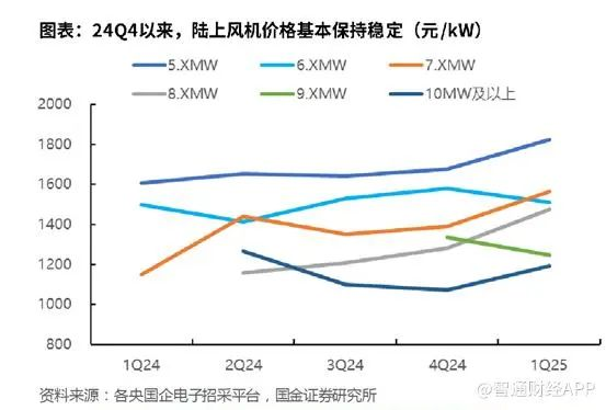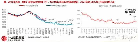 按照2025年4月价格进行对比,陆上风机中标价为1943元/KW,较2024年最低点上涨36.4%,较2025年1月份上涨19.0%。