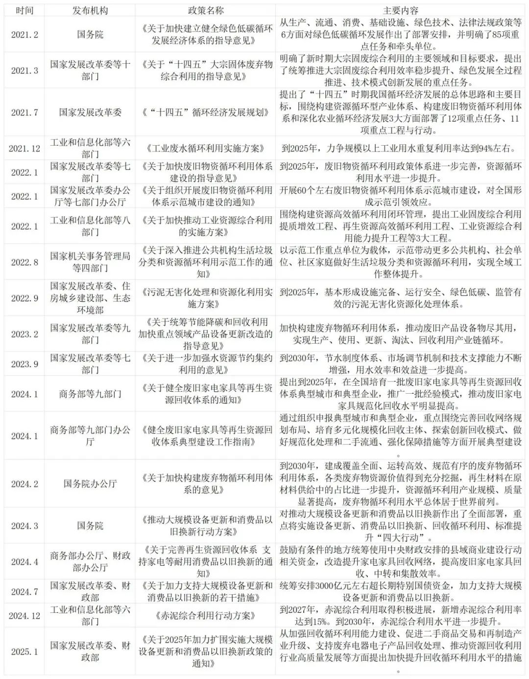 2024年3月,国务院发布《推动大规模设备更新和消费品以旧换新行动方案》,重点部署了回收循环利用行动等四大行动,从完善废旧产品设备回收网络、支持二手商品流通交易、有序推进再制造和梯次利用、推动资源高水平再生利用等方面提出了行动措施。2025年1月,国家发展改革委、财政部发布《关于2025年加力扩围实施大规模设备更新和消费品以旧换新政策的通知》,进一步加大“两新”政策支持力度,加快提升回收循环利用水平,并从加强回收循环利用能力建设、促进二手商品交易和再制造产业升级、支持废弃电器电子产品回收处理、推动资源回收利用行业高质量发展等方面提出具体措施。