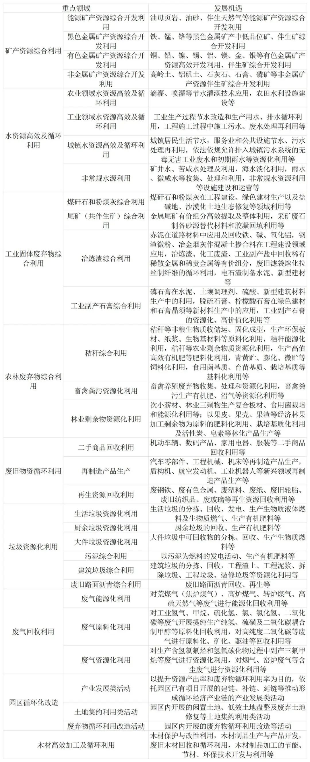 根据对《绿色低碳转型产业指导目录(2024年版)》《“十四五”循环经济发展规划》《推动大规模设备更新和消费品以旧换新行动方案》《关于2025年加力扩围实施大规模设备更新和消费品以旧换新政策的通知》等政策、规划的分析梳理,资源循环利用产业发展机遇主要集中在矿产资源综合利用、水资源高效及循环利用等领域。在产业层面,钢铁、化工、有色等行业通过固体废弃物综合利用、废气回收利用、余热余压回收等措施,提升工业资源综合利用效率,减少污染排放;农业领域通过秸秆综合利用、畜禽养殖废弃物利用、农作物加工剩余物利用等措施,创新“种养结合”等生态循环农业模式,实现农业资源的循环利用,减少农业面源污染;回收、加工和再利用废弃物或废旧产品的再生材料、再制造等产业也正快速发展。