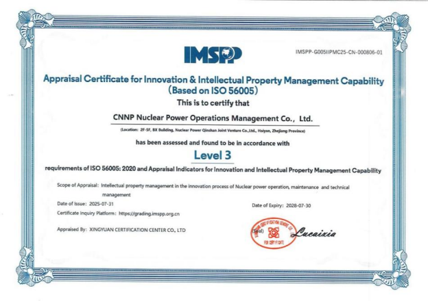 近日,秦山核电正式获得基于ISO56005的《创新与知识产权管理能力》3级证书。这是该国际标准正式推广以来中核集团认证的首张3级证书,也是秦山核电继2023年荣获国家知识产权优势企业后,在知识产权管理体系化建设上的重要突破。