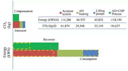 “污泥厌氧产沼气+热电联产”AD-CHP过程中产生的电能可以用于补偿污水厂的能耗,从而降低污水厂的碳足迹排放,甚至实现碳中和运行。