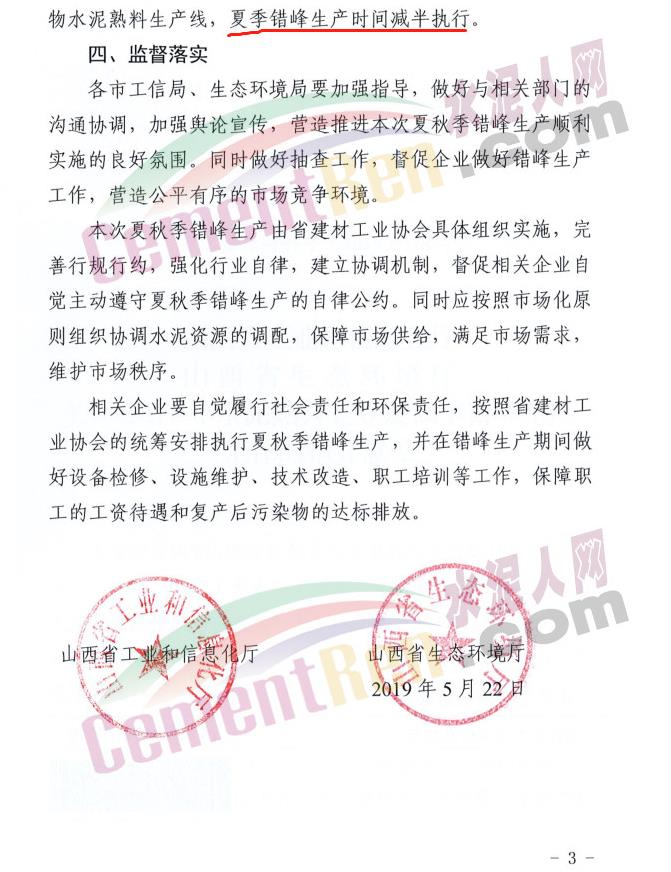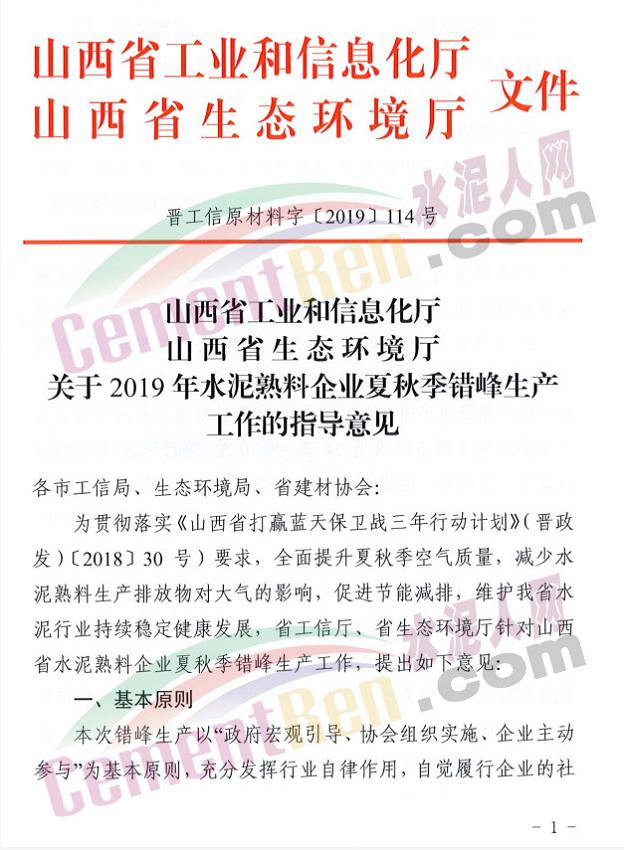 水泥人网消息,日前,山西省工业和信息化厅、山西省生态环境厅联合发布《关于2019年水泥熟料企业夏秋季错峰生产工作的指导意见》,该文件要求,全面提升夏秋季空气质量,减少水泥熟料生产排放物对大气的影响,促进节能减排,维护山西省水泥行业持续稳定健康发展,山西省工信厅、省生态环境厅对山西省水泥熟料企业夏秋季错峰生产工作,提出如下意见: