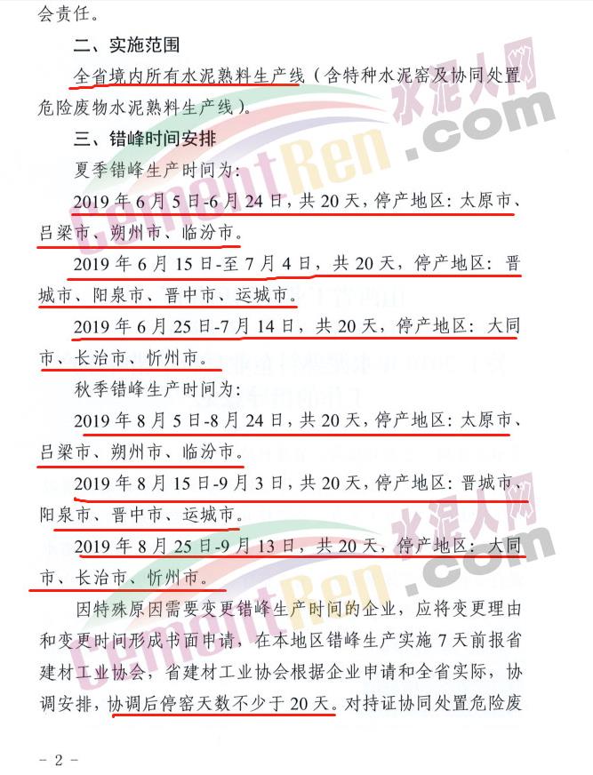 因特殊原因需要变更错峰生产时间的企业,应将变更理由和变更时间形成书面申请,在本地区错峰生产实施7天前报省建材工业协会,省建材工业协会根据企业申请和全省实际,协调安排,协调后停窑天数不少于20天。对持证协同处置危物水泥熟料生产线,夏季错峰生产时间减半执行。