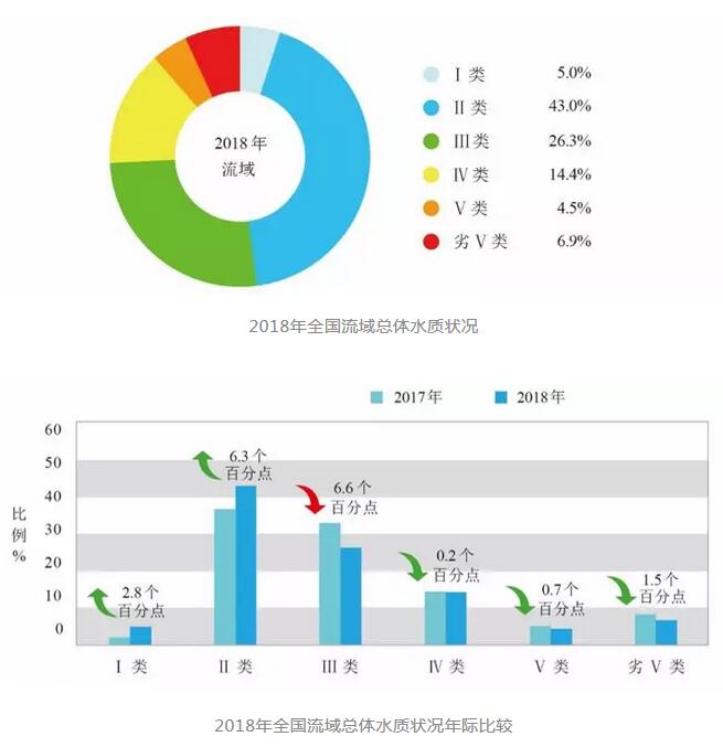 长江、黄河、珠江、松花江、淮河、海河、辽河七大流域和浙闽片河流、西北诸河、西南诸河的1613个水质断面中,Ⅰ~Ⅲ类水质断面比例为74.3%,同比上升2.5个百分点;劣Ⅴ类断面比例为6.9%,同比下降1.5个百分点。