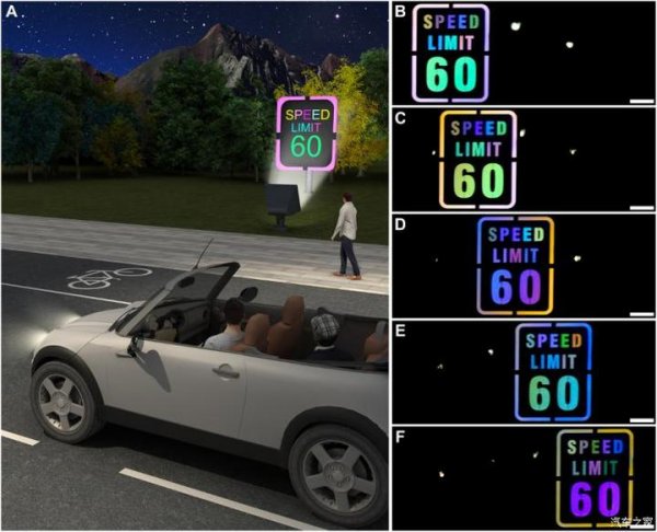 在其中一组实验中,研究人员用这种反光薄膜制作了一个带有数字和字母的限速标志,并在它附近放置了一盏白色光源。结果显示,当驾驶员快速的通过时,能看到标志上的内容似乎随着位置的移动而闪烁;在另一组实验中,研究人员把这种反光材料贴在车道线上,结果车辆经过时能看出车道线反射了前车的灯光,变得很明亮。对于驾驶员来说,标志上的颜色明亮而稳定,但对于路边的行人来说,路标的颜色似乎在随着汽车的飞驰和灯光的照射而闪烁。