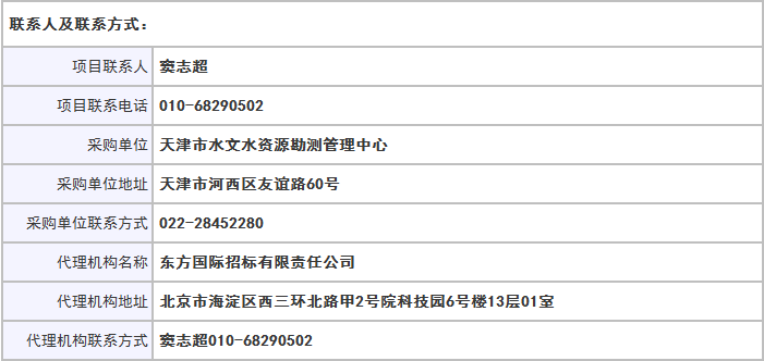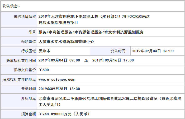 东方国际招标有限责任公司受天津市水文水资源勘测管理中心委托,根据《中华人民共和国政府采购法》等有关规定,现对2019年天津市国家地下水监测工程(水利部分)地下水水质采送样和水质检测服务项目进行公开招标,欢迎合格的供应商前来投标。