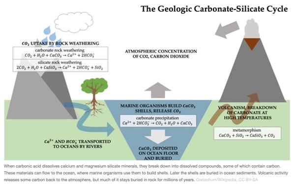 地球表面的岩石会受到受化学、生物、气候和板块构造的影响,当二氧化碳与土壤和海洋中的水结合生成碳酸时,就出现了化学风化。大约95%的地壳和地幔(地壳和地核之间的厚层)是由硅酸盐矿物构成的,是大多数火成岩的主要成分,当火山物质冷却和硬化时形成,这些岩石占地球陆地表面的15%。