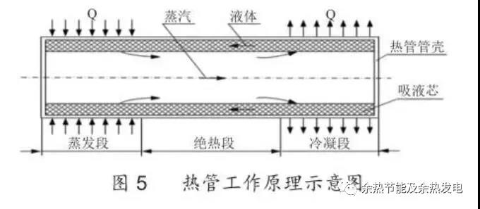 热管由管壳、吸液芯和端盖组成,将管内抽成1.3×(10 -1~10 -4 )Pa的负压后,充以适量的工作液体,使紧贴管内壁的吸液芯毛细多孔材料中充满液体后加以密封。管的一端为蒸发段(加热段),另一端为冷凝段(冷却段),根据应用需要,在两段中间可布置绝热段(如图5)。