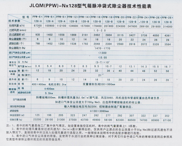 除尘器选型的主要技术参数为风量、气体温度、含尘浓度和湿度。根据工况的风量、气体温度、含尘浓度的最高数值,按路小于技术性能表中的数值为原则,其相对应的除尘的型号为所需除尘器型号。采用的滤料则根据入口浓度、气体温度、气体性质确定表中耗气量为该型号设备的最大耗气量,是工厂集中供气时的情况,如单独使用空压机时,表中耗气量要放大1.3倍当含尘气体浓度60g/m3时,表中所列处理风量可加大20%