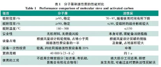 表1 为分子筛和活性炭的性能对比。