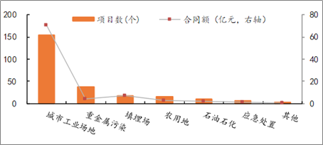 图表3:2019年全国不同类型土壤修复项目数量及合同金额分布(个,亿元)