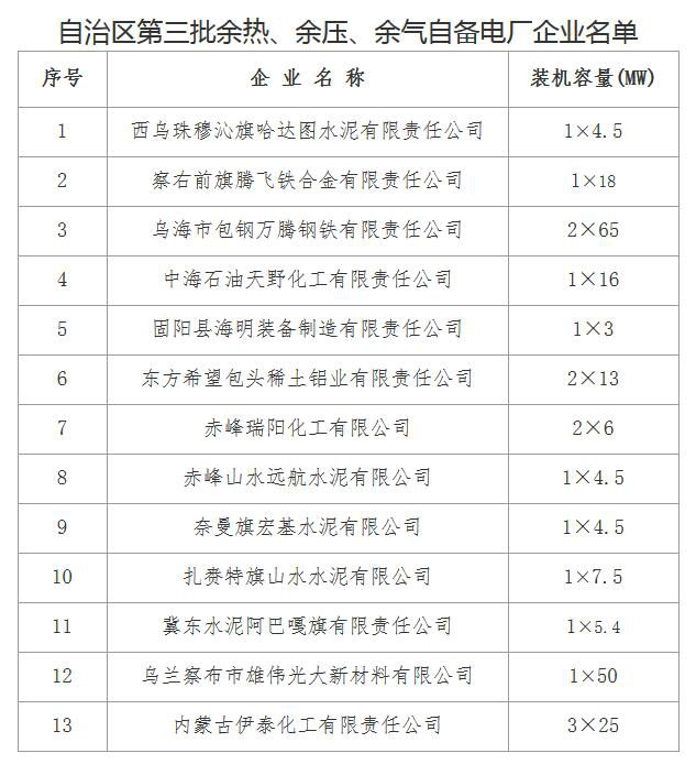 日前,内蒙古发布内蒙古自治区第三批余热、余压、余气自备电厂企业名单。详情如下: