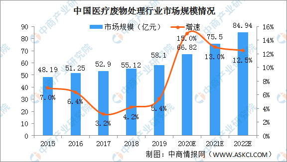 随着医疗废物管理逐渐深入,我国的医疗废物管理日益收到重视,从无到有,从粗放到精细,逐步完善和推进不断规范,医疗废物市场规模不断扩大。本次疫情会推动医疗废物处理产业链进一步发展。2019年中国医疗废物处理市场规模58.1亿元,随着我国人口老龄化加剧,医疗服务水平提高,预计中国2021年医疗废物处理市场规模将超过75亿元。