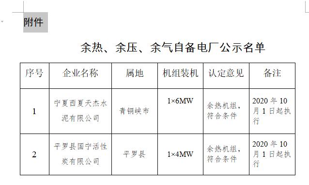 日前,宁夏公示余热余压余气自备电厂认定名单。详情如下: