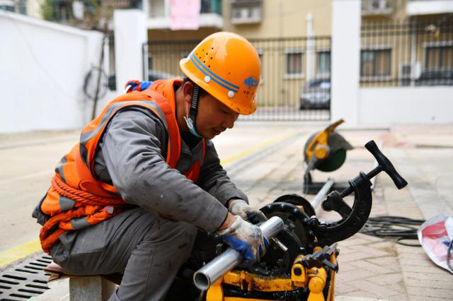 2020年12月23日,在武汉市青山区华通小区里,中国一冶的施工人员正在进行集中供暖入户管道的安装收尾工作。记者了解到,这是武汉市青山区129个小区余热供暖项目中的示范小区。