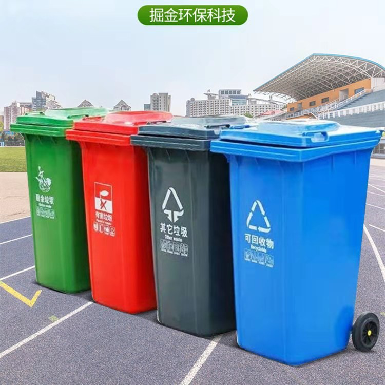 绿色:厨余垃圾在多种塑料垃圾桶组合的情况下,绿色代表厨余垃圾,厨余垃圾可以作为植物养分的肥料使用,土壤掩埋后可被大自然微生物和植物分解吸收,起到废物再利用的作用。主要包括:米饭和面粉食物残渣、蔬菜、动植物油、肉骨等,化学成分,淀粉、纤维素、蛋白质、脂类和无机盐。废塑料,废金属,废包装物,废旧纺织物,废弃电器电子产品,废玻璃,废纸塑铝复合包装等。厨余垃圾的垃圾桶是绿色的厨余垃圾是指日常生活中产生的易腐烂垃圾。相关单位食堂、宾馆、饭店等产生的餐厨垃圾;居民区产生的厨余垃圾;农贸市场、农产品批发市场产生的蔬菜瓜果垃圾、腐肉、肉碎骨、蛋壳、畜禽产品内脏等。有害垃圾垃圾桶是红色的有害垃圾是指对人体健康或自然环境有直接或潜在危害的物质废电池(镉镍电池、氧化电池、铅蓄电池等),废荧光灯管(日光灯管、节能灯等),废温度计,废血压计,废及其包装物,废油漆、溶剂及其包装物,废杀虫剂、消毒剂及其包装物,废胶片及废相纸等。其他垃圾垃圾桶是灰色的其他垃圾是指除可回收物、厨余垃圾和有害垃圾之外的生活垃圾。