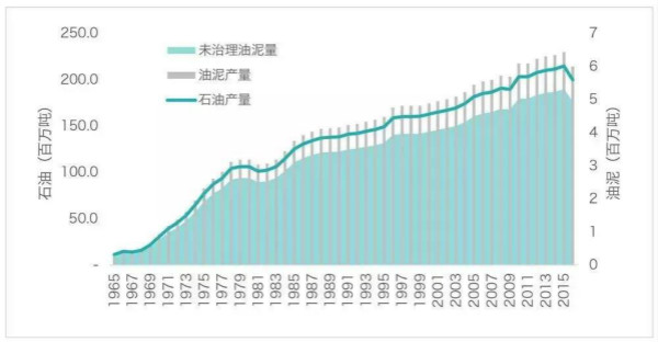 我国每年产生百万吨的含油污泥,按含油污泥约占原油的3%计算,2016年我国含油污泥产生量在600万吨左右,若加上石油化工产生的“三泥”(生化污泥、池底污泥及浮渣),油泥总量要大得多。油泥污染多位于生态脆弱地区,危害大、难监管,治理情况差,实际处置率仅为17.45%,据1965年以来石油产量数据,油泥存量即达1.59亿吨,按每方1500元/吨处理成本核算, 其存量规模达到2486亿人民币,每年新增市场空间约90亿人民币。